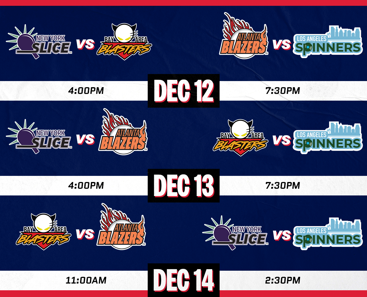 Major League Table Tennis heads to Los Angeles, CA, Dec 12–14 at Terasaki Budokan. The Los Angeles Spinners defend their home court against the Atlanta Blazers, Bay Area Blasters, and New York Slice.