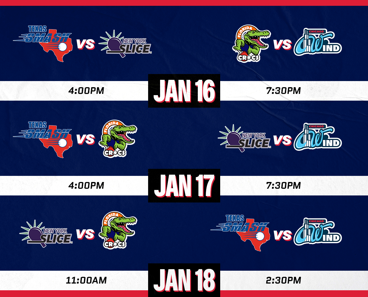 Major League Table Tennis heads to Willowbrook, IL, Jan 16–18, 2026 at Compass Arena. The Chicago Wind defend their home court against the Texas Smash, New York Slice, and Florida Crocs.